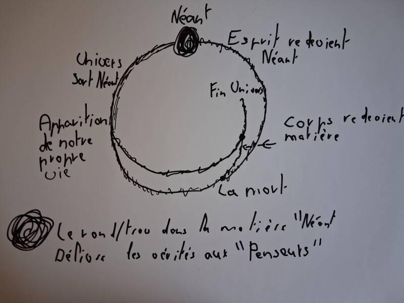 Autrement dit, la vie se passerait dans la matière, le corps, donc l'univers à droite et la mort du côté de l'esprit dans le rien/néant, à gauche, donc ce qui a créé l'univers.
